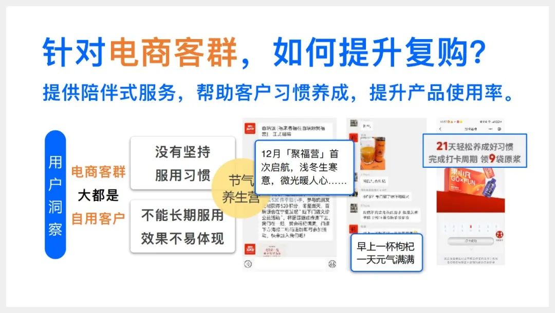 基于这个洞察,百瑞源电商团队除了在朋友圈为顾客提供养生知识外,还设立了“21天养生打卡计划”、“24节气养生营”等互动社群,用户运营同学转换为“养生顾问”陪着大家“花式养生”,加入社群的客户在陪伴而行的氛围中自然而然的养成了日常食用枸杞的习惯——每到结营日,养生顾问为完成打卡的客户发放优惠福利,在真真切切感受到食用枸杞带来的改变后,复购周期自然也得到大幅提升。
