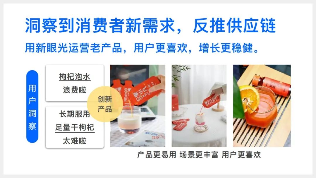 基于这层认知,百瑞源把目光投向了枸杞原浆。1袋枸杞原浆≈100颗新鲜枸杞,不仅满足了人体一天所需要的营养,而且携带方便、开袋即喝超级简单,显然更适合当代消费者的生活方式。实际上,枸杞原浆是百瑞源的老产品了,但之前因为缺乏对客户新需求的准确洞察,并没有投放资源做主打。百瑞源重新为这个产品增设了生产线,通过换包装、改名字、输出大量内容和做投放等方式成功打造出“枸杞原浆”、“早红晚黑”套装等具有引领性的出圈新品。