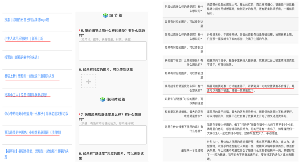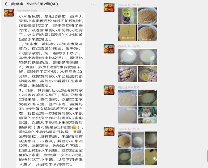 二是通过用户反馈体验报告做新品种草。邀请被选中的用户进入体验官群,用户把用小米做饭的图片和文字不断地发到群里,一方面能互相启发,提供食谱灵感,另一方面也增加了使用场景,实现有效种草。