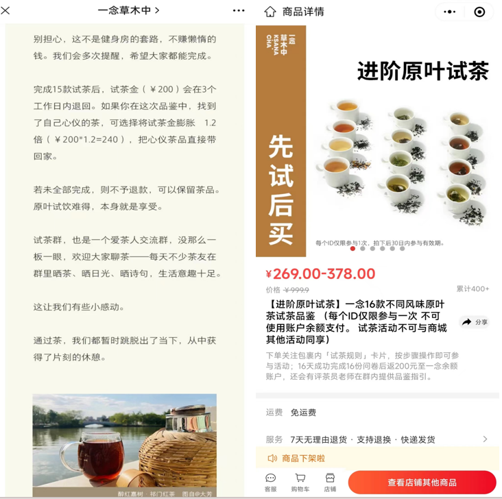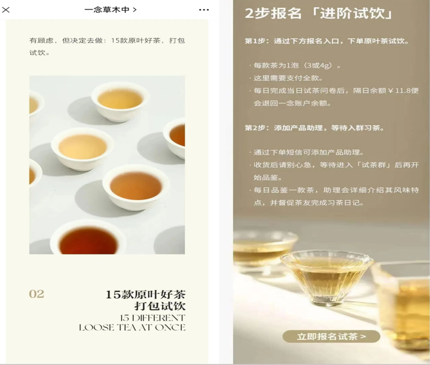 通过这种方式,品牌首先筛选了后续大概率可以转化的精准用户,因为如果你不愿意付费体验、光想薅羊毛,估计后边也不会花钱买茶叶,不如直接把这些人拒之门外,留下的便都是有意向的客户。