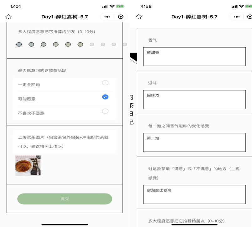 反馈报告能够收集用户最真实的感受,除了前面说的可以帮助优化、改进或者淘汰产品外,还能获得新品推广的文案灵感。比如一念的反馈报告,会让你描述香气、滋味的变化,方便后续撰写产品文案。他们把茶叶的香气和滋味分成了前调、中调和后调,就像香水一样,比如焦糖栗子味、爆米花味和甜橙味等,这些生动的描述,相信很多素材就是来自客户反馈。