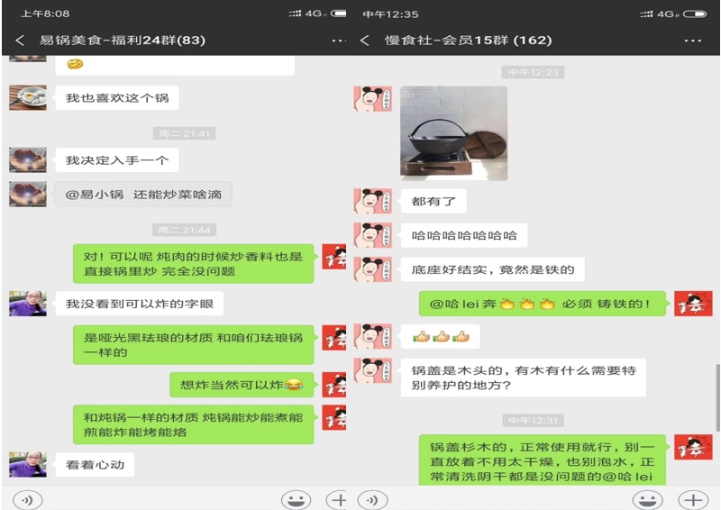 我们会把购买三口锅以上的资深老客户拉进会员群,因为都是热爱做饭的忠诚用户,大家聚在一起有聊不完的话题,比如:私房美食、时令食材、美食拍摄、快手菜......