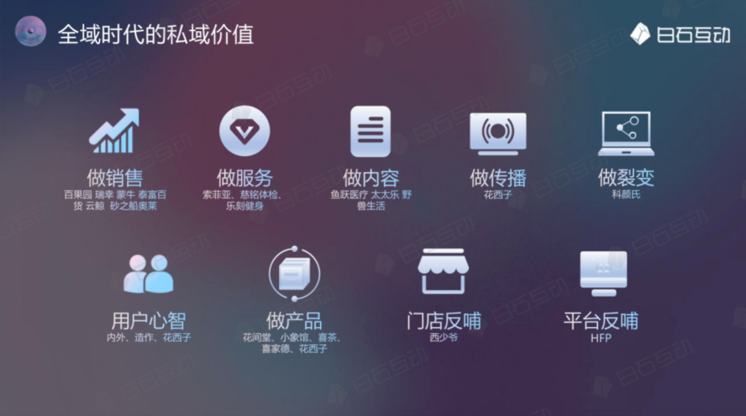 私域并非只能打折促销卖货,希望借以上案例打开思路,除了拉群拼团秒杀,你还可以选择做服务、做内容、做产品体验、做裂变、做用户心智、做门店反哺,通过这些方式赢得一批忠实用户,在私域内获得精准的用户数据洞察,从而推动用户的传播、裂变,带来全域增长。