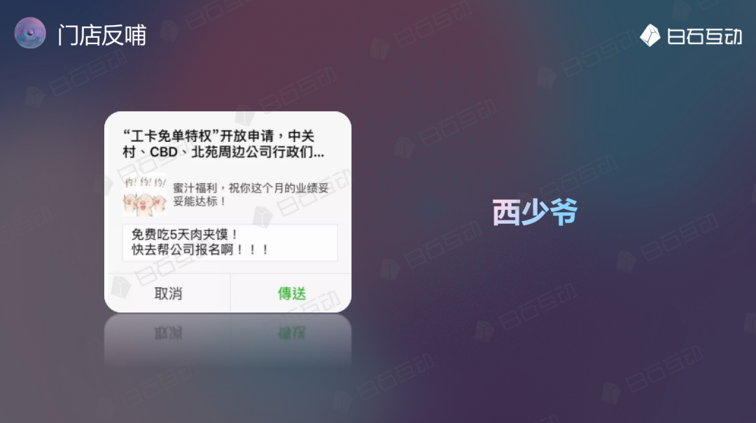 根据该洞察,西少爷改变了开业营销方式,每开一家新店,都会在公众号发文并触达品牌用户,公布一则优惠政策:开业当天,门店周边大公司可以凭工牌免费领一个肉夹馍。通过这种方式,触达精准用户到店消费,比传统漫天撒传单的方式精准高效得多。
