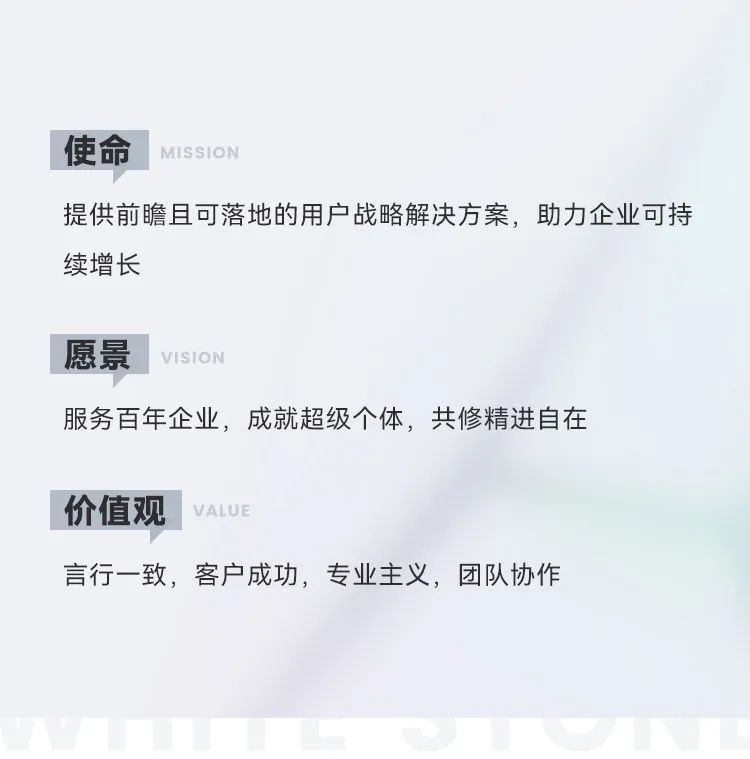 白石能帮助客户形成真正以用户为中心的思考方式和工作习惯。白石是一个非常注重“创造价值”的团队,这个价值不仅对外部客户的贡献,也体现在内部对员工,看到每个人的长处并给予创造价值的机会。通过咨询业务,推动客户深入理解用户,帮助客户通过用户战略落地带动业务升级和组织变革。