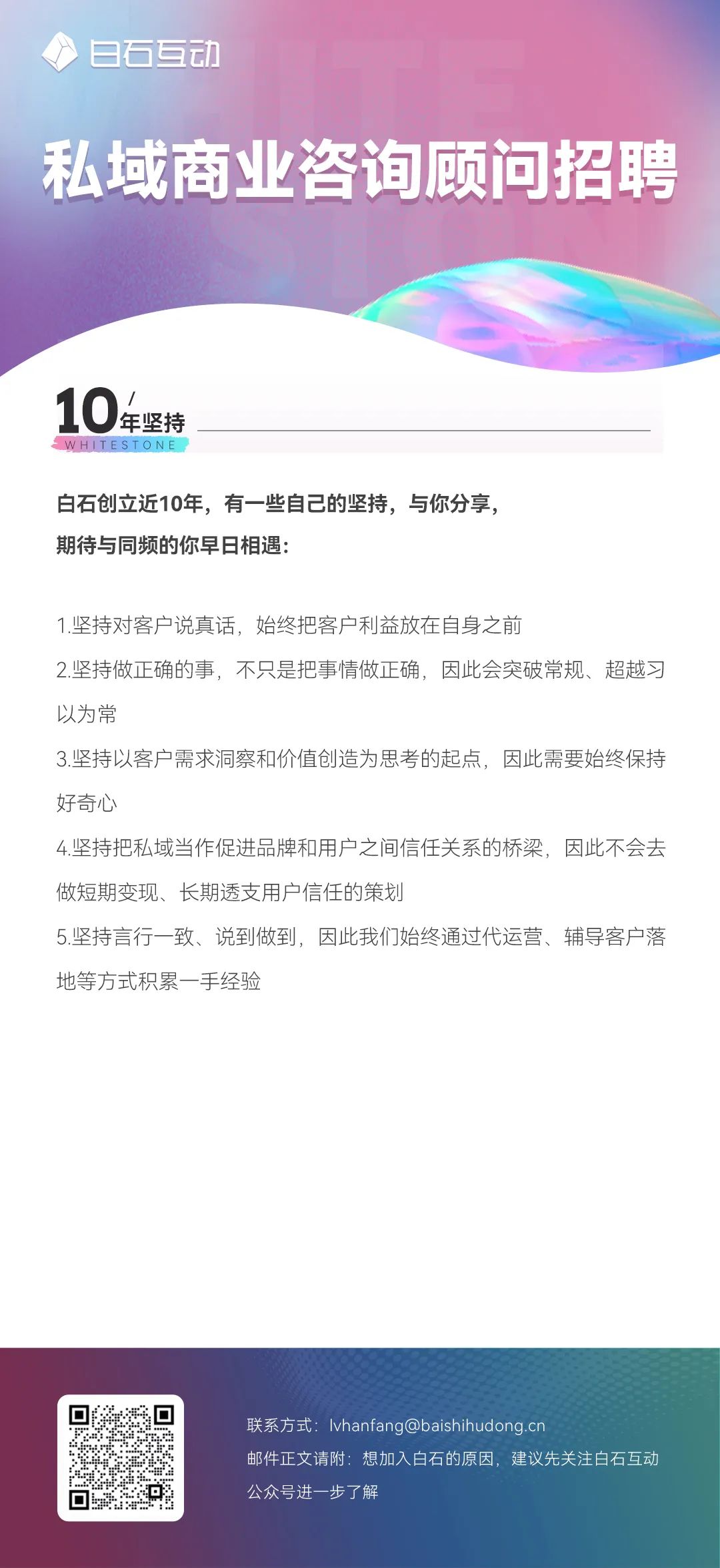 我认为白石最大的价值是:能为存量时代企业的长久发展打下扎实的用户基础。我希望站在我的位置上,可以链接更多的人,让更多人了解白石和选择白石,从而选择更长久有效的私域。