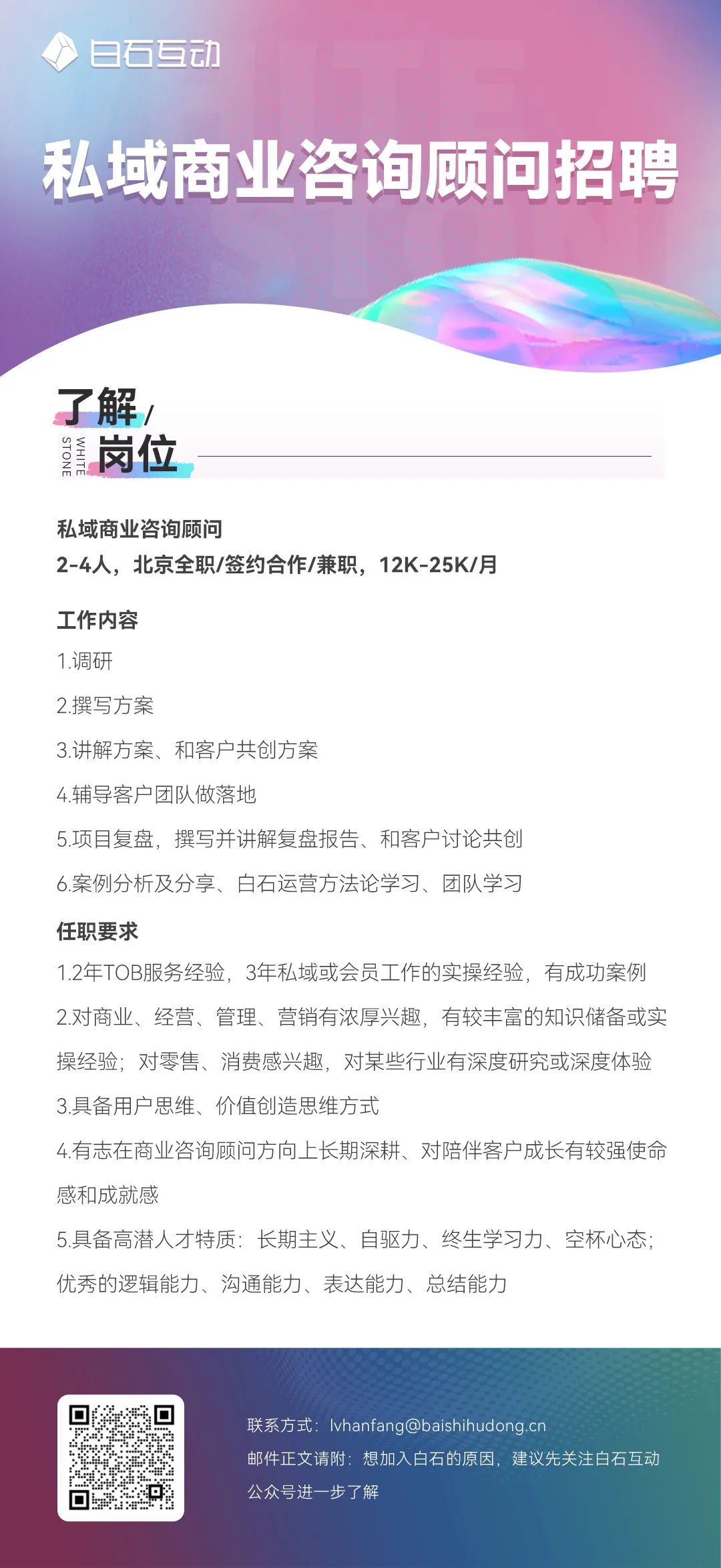 最后,就是充分准备之后,“团队伙伴之间的观点碰撞”了。学多了知识的团队很容易陷入“不自知的傲慢”,而团队学习中时常产生的“激烈碰撞”就会让大家有更多元的思考角度,学会站在对方立场了解其观点背后的原因,这有助于我们在工作中更好的理解客户、服务客户。问:开展读书会这大半年来,你觉得团队最明显的变化有哪些?烁烁:思考方式的变化,团队对“何为对的事”提到的次数多了。处事成熟的变化,团队对“如何做正确的妥协”的讨论和行动更多了。“我能贡献什么”的行动更团队化、日常化了。相信没有人会否定“做对的事”在工作中(甚至人生中)的必要性和重要性。但实际上,并不是所有人都能时刻关注自己是否在做正确的事,对什么事是正确的判断也并非一直准确,更不用说能一直坚持做对的事了。“做对的事”似乎更像一种想当然要有又不一定常在的状态。白石作为“专业”咨询团队,在服务客户中“选择并坚持做正确的事”不但是对自身的要求,更是判断“是否专业”的重要标准。伙伴们在读书会结束后,每个人对“正确的事”有了什么新的理解?在工作中是如何应用的?且随我来看。吴凡:我们要给客户创造的价值就是要推动客户变得更好,比如在品真阁项目上提出的专业建议,可能一开始客户都觉得困难重重,像活动选品、行文逻辑等等,但我们会不断和客户沟通,坚持做我们认为正确的事而不是容易做的事,也不怕因为和客户有不同想法而产生更多讨论。我们这样做,客户能感受到,白石不是单纯的供应商,而是一个专业的顾问团队。服务半年下来,很明显感受到品真阁团队是在一点一点发生变化的,当然坚持这一点不容易,甚至说顺从客户“更安全”,但那显然不是“对的事”,反而坚持做对的事,为我们赢得了来之不易却更为长久的客户信任。问:作为咨询顾问,难免遇到与客户意见冲突的情况,这个时候你会如何处理?利红:做决策必须从什么是正确的出发,不能从什么是可以接受的出发,更不能从谁是正确的出发。在实际服务客户的过程中,常常遇到客户在表达“这个提议很好,但我们现状如此,推动会有困难”,这种情况下,当我们和客户都在以“尽快落地”为目标时,落地的情形很快会变成脱离边界条件的“妥协”(不去尝试,不敢创新,按部就班),结果因为过程中不断妥协,动作都有打折,什么结果都拿不到。以前在和客户讲方案时我会按照自己理解的方式去告诉客户,读完德鲁克之后,我会更注意站在客户的角度,讲清楚方案背后的逻辑,让客户真的能理解我们为什么要这样做。而且在讲方案的过程中,我也会着重提醒客户注意“边界条件”,让客户明确了解能促使项目顺利落地的必要因素,从而让双方在思想和行动上更同频。雅智:在读这本书之前,我看待事物的角度会比较零散,做选择缺少明确的标准。现在拿到一些项目或者任务,首先会思考做这件事情背后的目的是什么?要达到什么效果?效果的评估标准是确定的还是不确定的?如果确定,那是什么?因为白石经常会做一些创新的尝试,这些创新很难在初期确定明确的标准。然后再去思考怎么去做,在过程中也会有意识的进行回顾、审视。这个步骤让我在做事时有了一个清晰的标准,让所有决策更可衡量,避免了很多无意识的偏离和人云亦云。问:“正确的事”和“正确的妥协”这两者的关系是什么?郭思:德鲁克在书中提到:“有效的管理者明白什么时候必须按照原则做决策,什么时候应该量体裁衣和区别对待。他们明白决策的最微妙之处在于对妥协的拿捏,并已学会怎么区分什么是正确的妥协,什么是错误的妥协”。对我算是一个颠覆观点,我们以前被教育更多的是,妥协就是背叛、就是软弱,居然,还有正确的妥协!正确妥协的前提,是知道“什么是正确的”。知道自己的目标、自己前进的方向,才可以找到这个标准,明白什么叫正确的妥协。正如我们在与客户的共创中,我们要为客户指出一个更有利于品牌长期发展的前进方向,同时也要结合客户的情况和实际需求,平衡好两者的关系。特别在私域运营上,白石一直相信私域还有更多比销售更有价值的作用,比如对品牌传播的价值、对用户忠诚度的价值、对转化率提升的价值等等很多值得挖掘的潜力,这对于很多企业来说是很新的概念,大部分企业还只是希望通过私域看到销售数据的增长,我们不会否定客户的需求,但同时我们也应该为客户提供更多看待增长的方式和评判标准。在我看来,正确的事就像一个前进的大方向,但考虑到每个阶段的有效性,我们也应该结合客户的情况做出正确的妥协,让这些妥协的点落在这个大方向的轨迹上。坚持做正确的事,延伸到白石的业务上,是坚持做“对的私域”,而不是“流行的私域”。白石为企业规划的私域,不是大家眼里那个理所当然、所有企业都整齐划一的销售平台,而是通过用户关系深化后可以为整体创造更大的价值、做出更多贡献的定制化私域模式。“不按部就班的工作”、“岗位职责说明只是我工作的起点”、“在更全面的认知组织需要后找准自己的身份角色”是团队伙伴对贡献理解的提炼,让我们一起来了解他们。问:在白石将近10年了,这个过程中都做过哪些角色?你对贡献的理解是什么?凯凯:到明年就整10年了,白石给我的感觉就像母校一样,我感受着她的变化,她也陪伴着我的成长。
