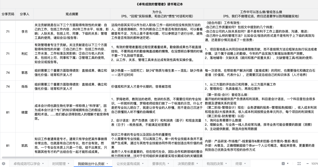 德鲁克在《卓有成效的管理者》中提出:“有效虽然可以学习,但无法教授,它不是一门课程,而是一种自我修炼。”在如今经济普遍下行的大环境里,很多企业都希望员工能争分夺秒地做出业绩,实现利润最大化,即使是必要的学习,也会倾向在工作时间以外,或者用更精简的方式进行。而白石的团队学习却有点“反其道而行之”——每1-2周一次,每次2-4小时不等。这不禁让人好奇,开展读书会究竟是为了什么?达到了怎样的效果?团队和个人又有哪些收获?问:我了解到白石的客户已经在排期了,既然这么忙,为什么还要坚持学习?深度思考的方式有很多,为什么是共读会,而不是写总结报告或者其他形式?烁烁:从两个层面说吧。第一个是我与荣总的切身体会。创立白石之前,我们俩都在德鲁克管理学院工作,当时我们正是以“团队学习”的方式学习和思考的,读的也是《卓有成效的管理者》这本书。一年下来,我们团队开了80多场读书会,荣总甚至为此写了十几万字的读书笔记。十几年过去了,我感受到那场旷日持久的团队学习给我的思考方式带来了颠覆性变化,特别是“坚持做对的事”和“我能贡献什么”这两种思考方式的叠加,简直就是打开了“广阔无限的自由发展之路”。(ps.彼得·德鲁克管理学院,Peter F.Drucker Academy,简称DA,是国内唯一的、由彼得·德鲁克先生及其家族授权的管理学院。学院以传播德鲁克先生的管理思想为己任,致力于帮助中国的知识工作者学习和实践德鲁克的学说。)第二点,咨询顾问的核心竞争力是学习能力。团队学习的底层逻辑来自彼得·圣吉关于学习型组织的经典之作《第五项修炼》,它可以让组织和个人得以持续进化,让我们既有开放的能力、也有探寻的意识,并以此为基础形成自己独立且有深度的思考,这正是咨询行业需要的。问:那读书会具体如何进行?在环节设置上,有什么讲究?烁烁:首先我们每次只围绕一个章节展开讨论,读书是方法不是目的,所以不求快、求深入、求内化。其次,我们要求读书会之前每个人先在共享文档上输出自己的读书笔记,因为团队在一起的时间很宝贵,每个人都要带着思考来,这样无论是3个小时、还是4个小时的学习,就都是深入有质量的。我听说,一些平时不太习惯读书写笔记的伙伴,会在团队学习之前把这个章节看三遍,生怕思考不够深耽误了时间。再次,读书笔记设置了3个格子:第一个是“观点摘要”,把认为有价值或有共鸣的原文摘出来,帮助大家迅速拉齐;第二个是针对原文的“为什么”,这要求我们全面系统地思考作者为什么说这句话,他的语境是什么,背后的原因是什么,然后,批判性地看待(甚至是质疑)作者的观点,避免惯性地以观点理解观点,理所当然地相信权威,也是形成独立思考能力的关键;第三个是“工作中准备怎么做/曾经怎么做”,将书中所学回归到工作应用上是我们最终的目的,我们不做理论派,终归还是要学以致用,脚踏实地。只有真正将理论结合到实际场景,内化成自己的思考方式和工作习惯,才能做到所学为我所用。