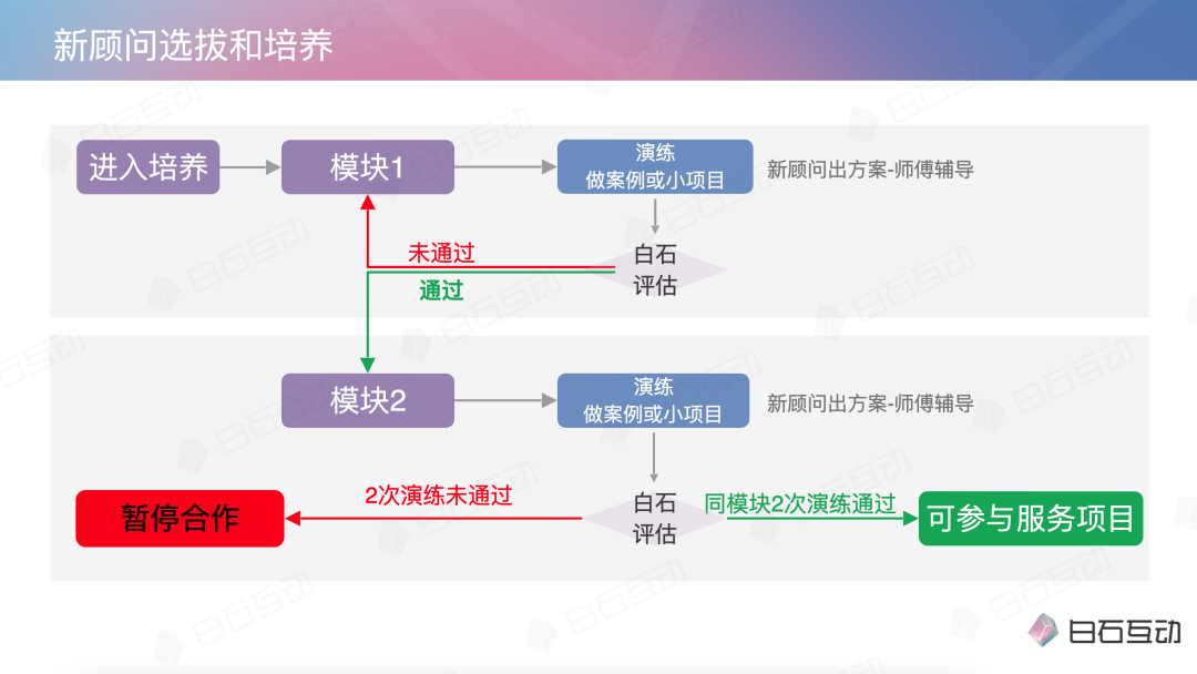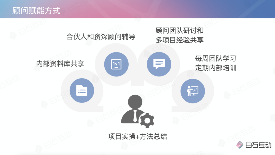 利红:在顾问对接客户前,项目组伙伴其实已经建立好前置信任了,顾问的工作重点更多是在模块交付和落地辅导上,白石的客户也都非常理解和配合。
